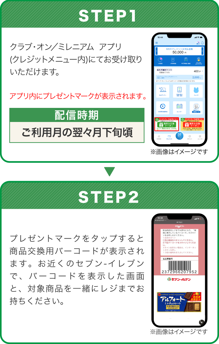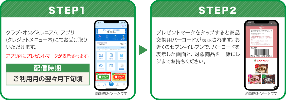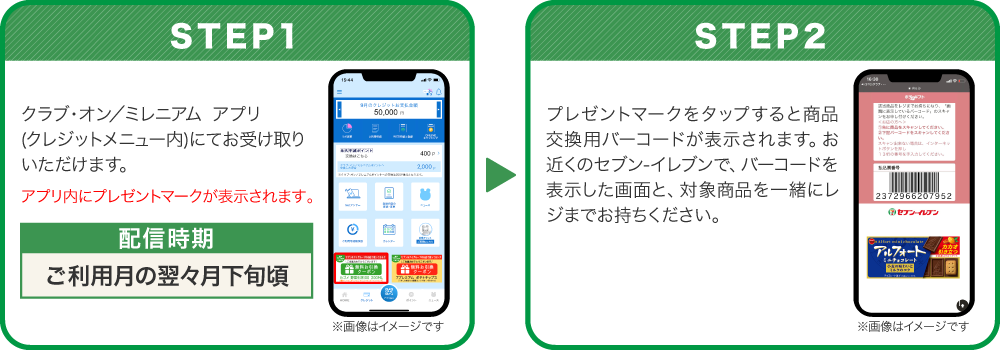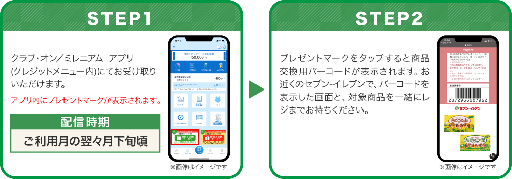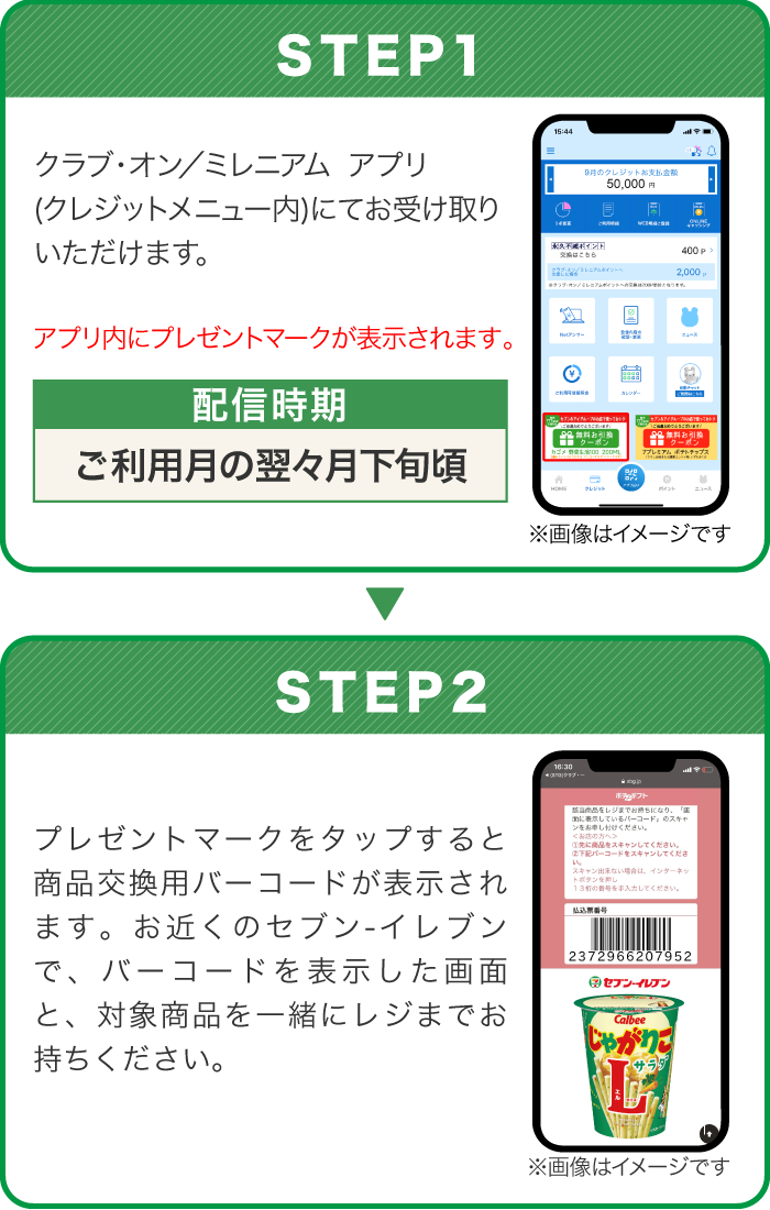 - ※当選者の発表は、ご利用月の翌々月中旬頃のクラブ・オン/ミレニアム アプリ(クレジットメニュー内)でのデジタルギフトクーポン配信をもってかえさせていただきます。