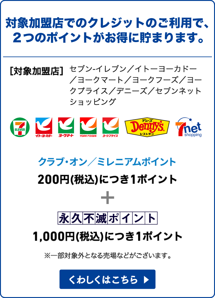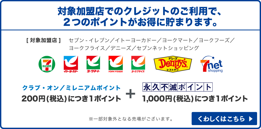 - ※QUICPay、Apple Pay、Google Pay、iD、PayPayや楽天Payなど、クラブ・オン/ミレニアムカード セゾンを登録している各種決済のご利用は対象外となります。