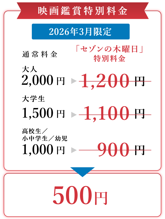 - ※2026年3月の木曜日は、「スーパーセゾンの木曜日」実施のため、各木曜日の上映作品に対して、1回のみ(同伴者1名様含む)ご利用いただけます。